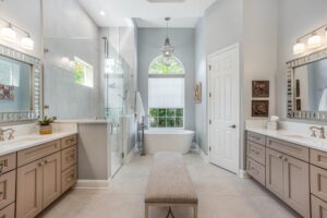 Another important aspect of building a home is creating spaces that cater to your needs. A zero-entry shower for instance may be a must. Maybe you want two vanities with plenty of storage in your master bathroom as shown in this photo.