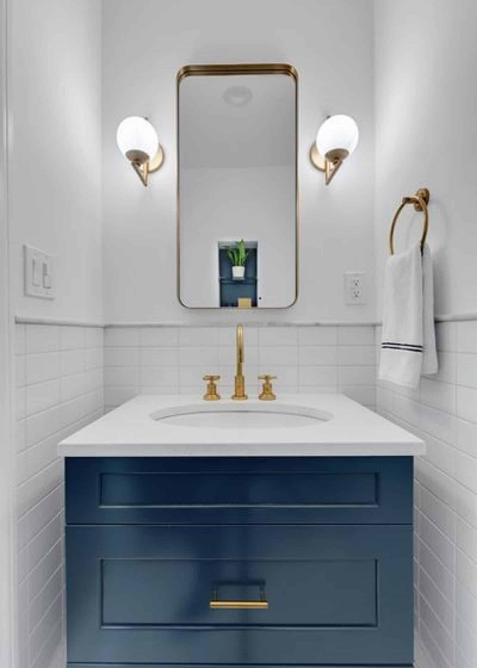 Here’s a tip for staying within a reasonable powder room budget. Paint your current vanity a vibrant color or add a new painted vanity. Add subway tile around it for a clean and fresh look. Finish